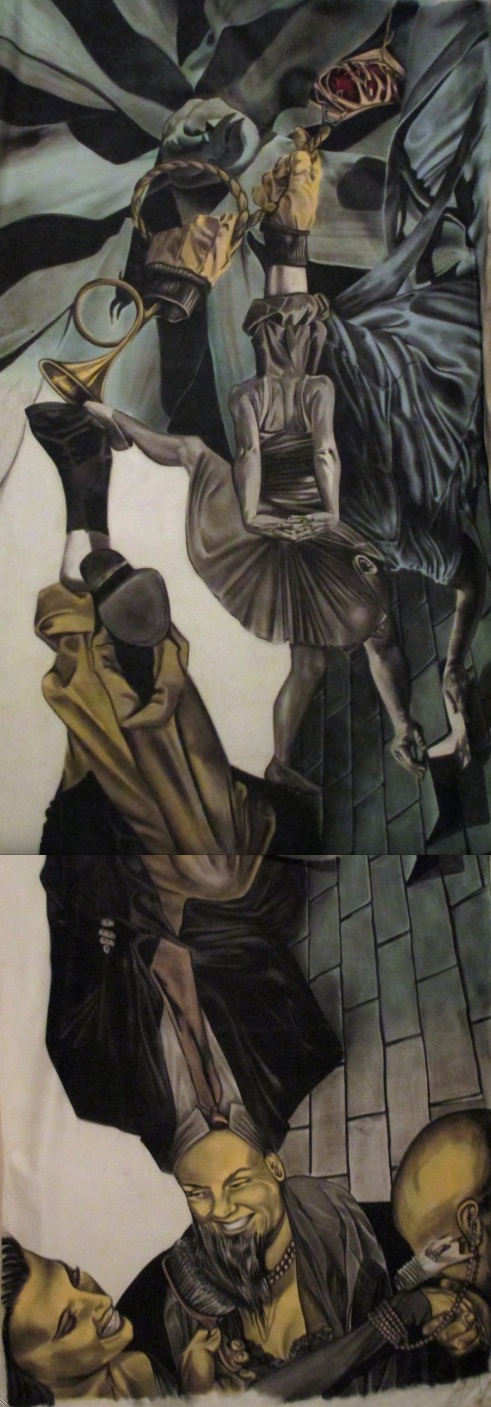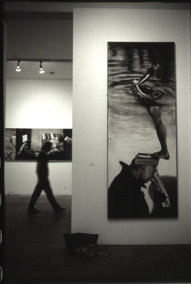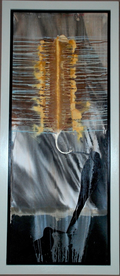 Bird Feather 18″ x 48″, is acrylic and gesso paint on muslin. 1998