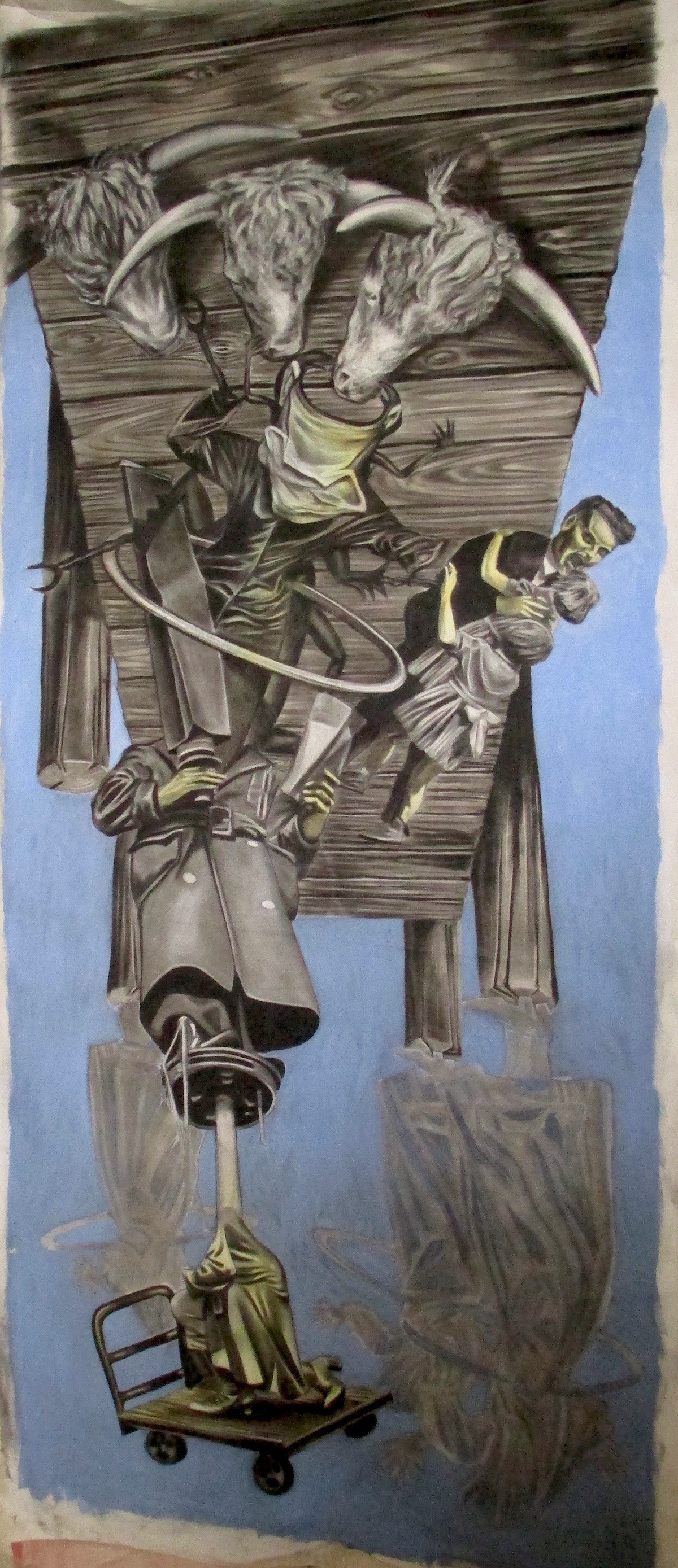 Roof (shown unfinished). paint and compressed charcoal on canvas. 144″ x 48″. 1992